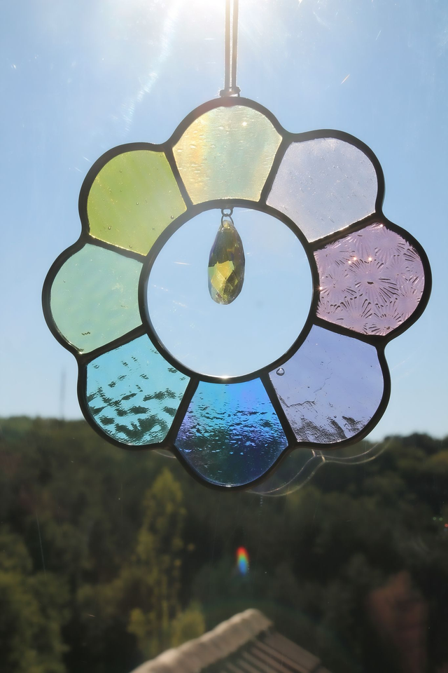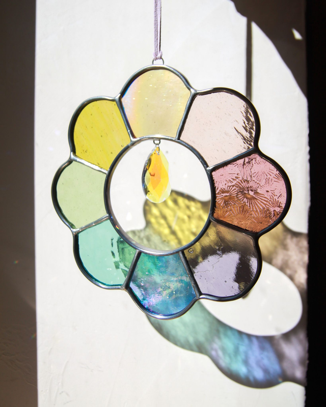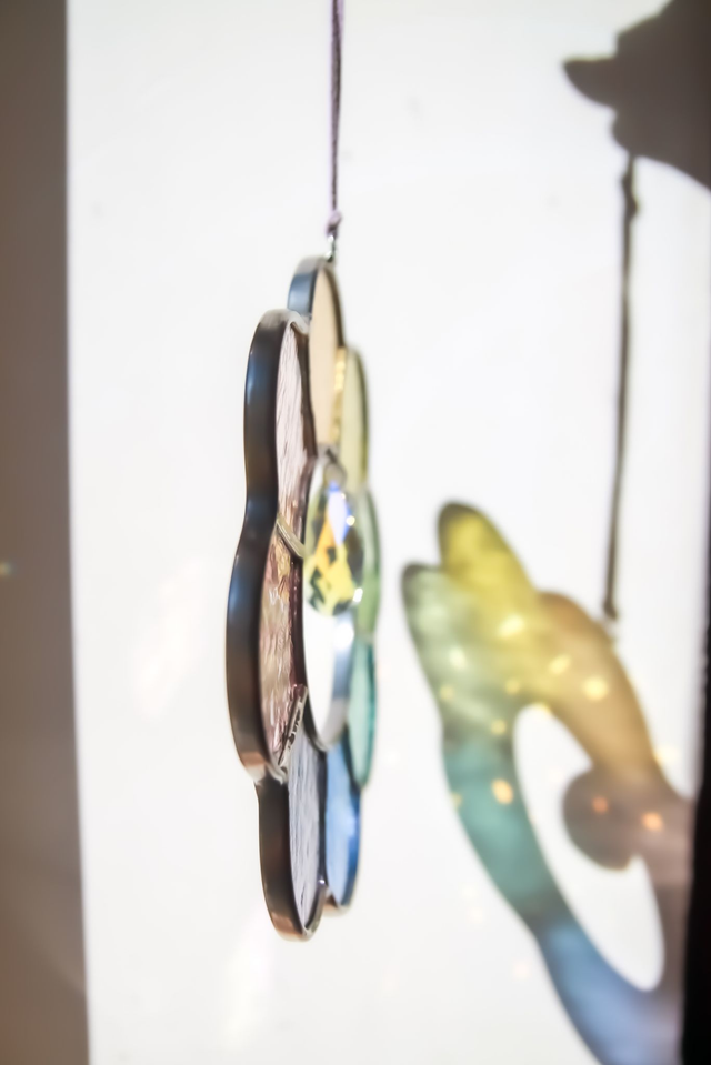 Au centre, un attrape-soleil disperse une pluie d’arcs-en-ciel, comme une invitation à faire entrer la paix, l’amour & la lumière