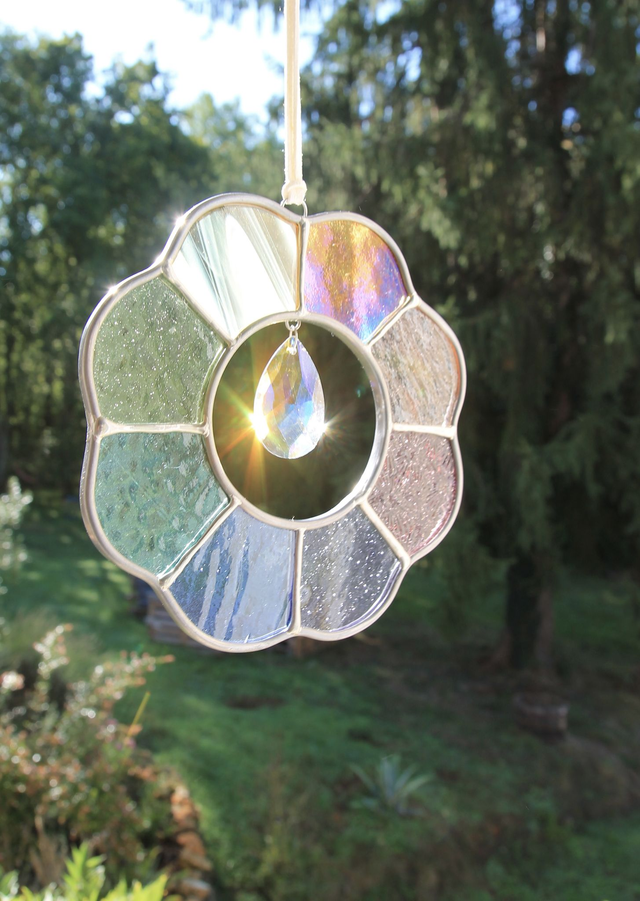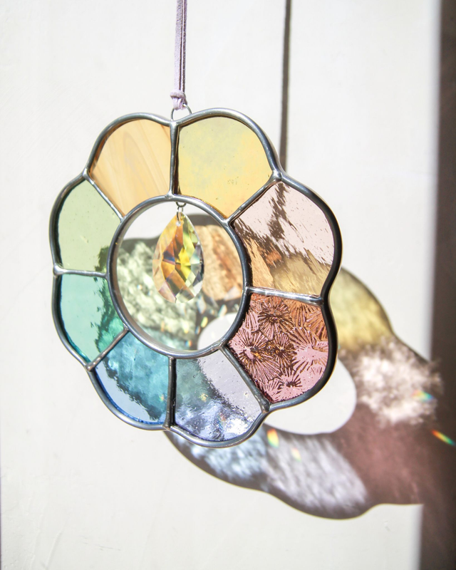 Au centre, un attrape-soleil disperse une pluie d’arcs-en-ciel, comme une invitation à faire entrer la paix, l’amour & la lumière