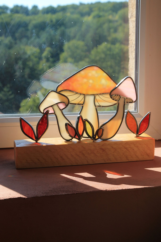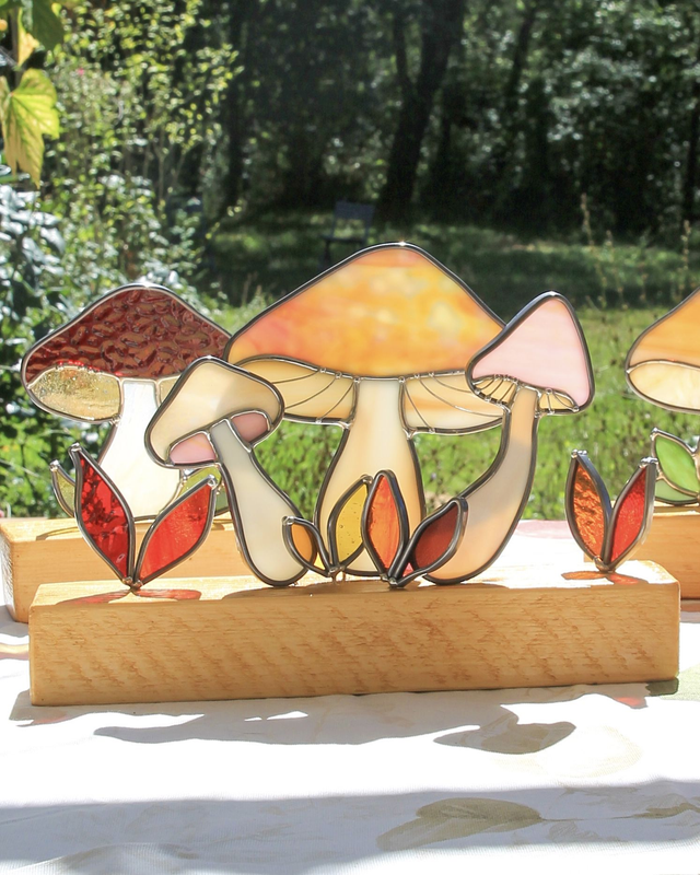 Le chapeau du champignon central est façonné dans un verre marbré artisanal, révélant ses couleurs uniques sous la lumière du soleil.