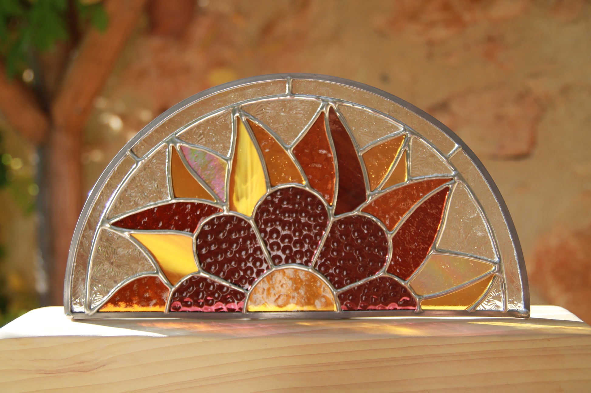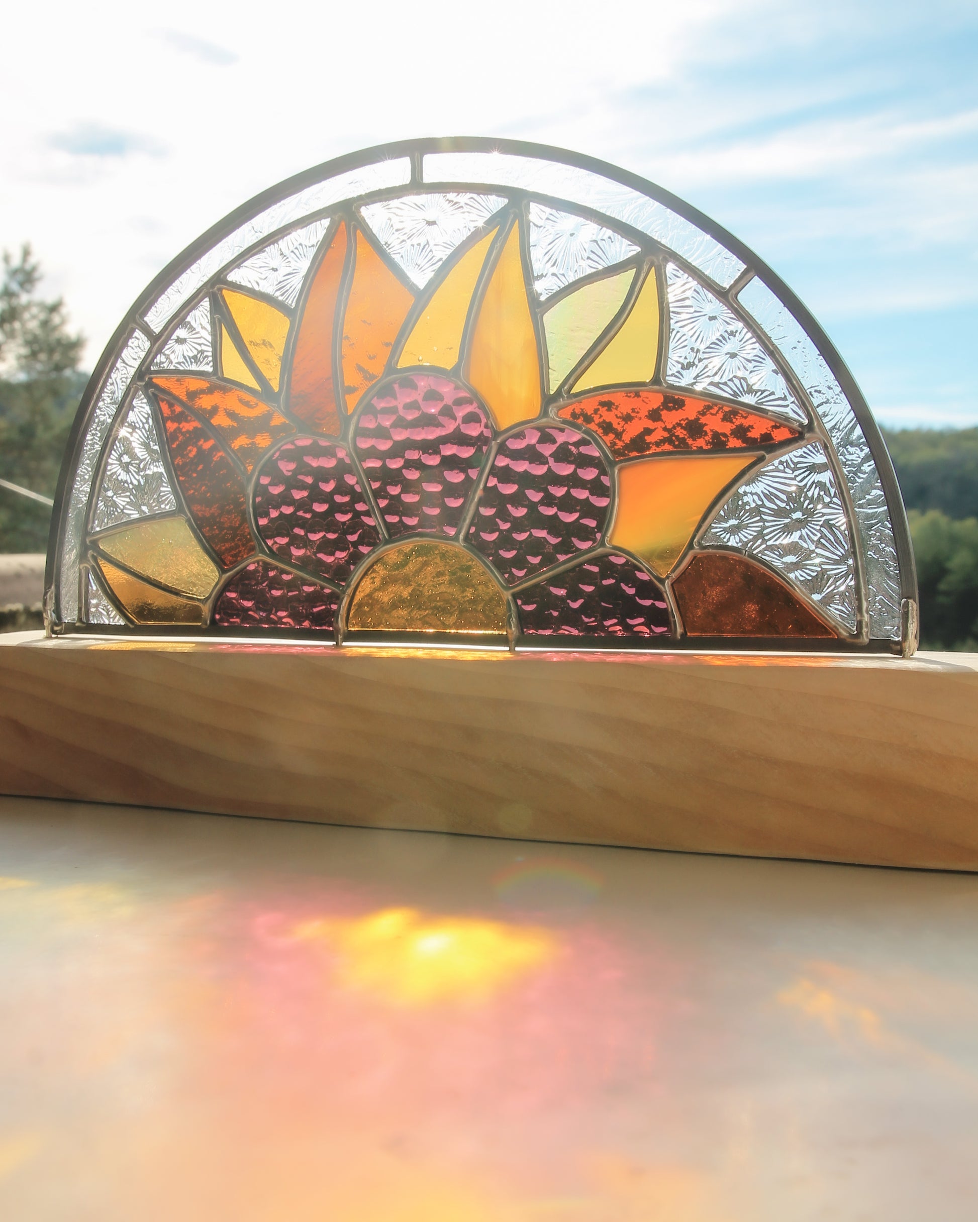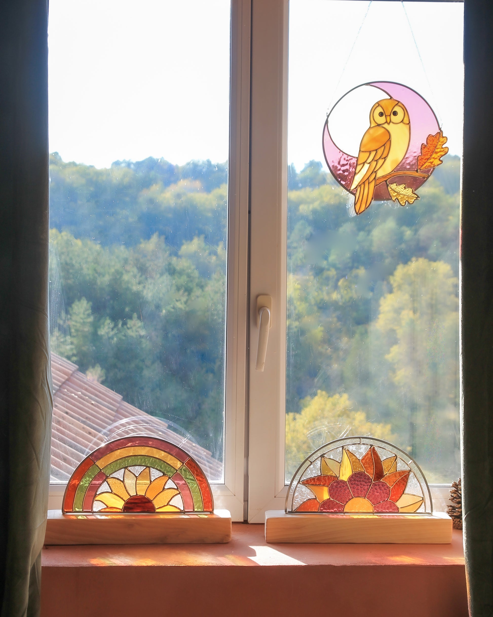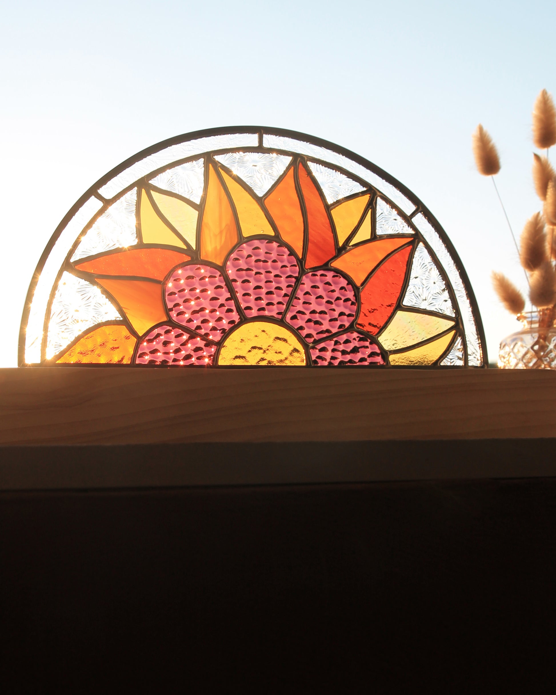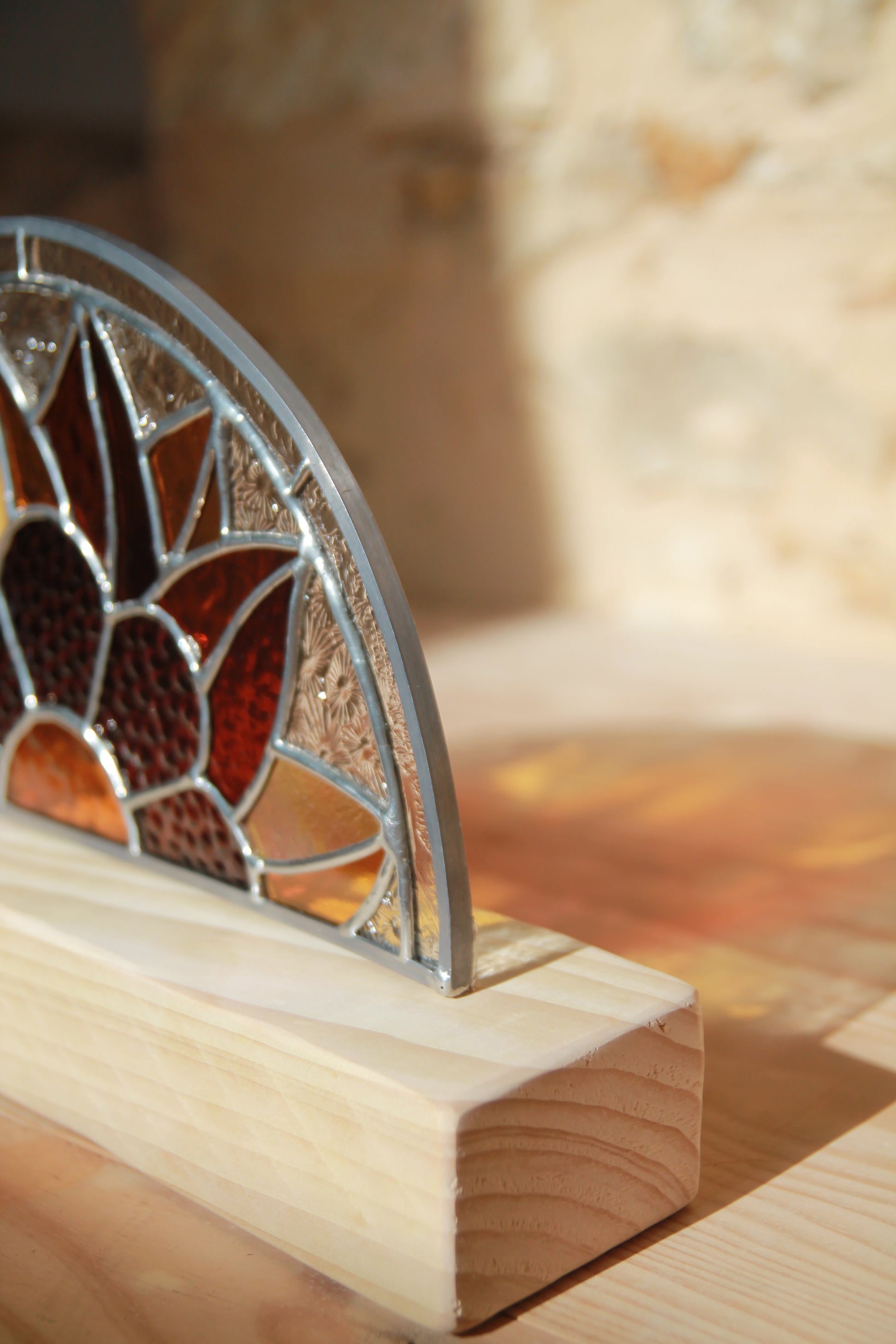 Entièrement façonné à la main dans mon atelier, chaque vitrail est assemblé au cuivre, à l’étain et au plomb selon la technique traditionnelle Tiffany. Les verres peuvent présenter de fines stries ou de petites bulles d’air : des particularités naturelles de sa fabrication qui font son charme