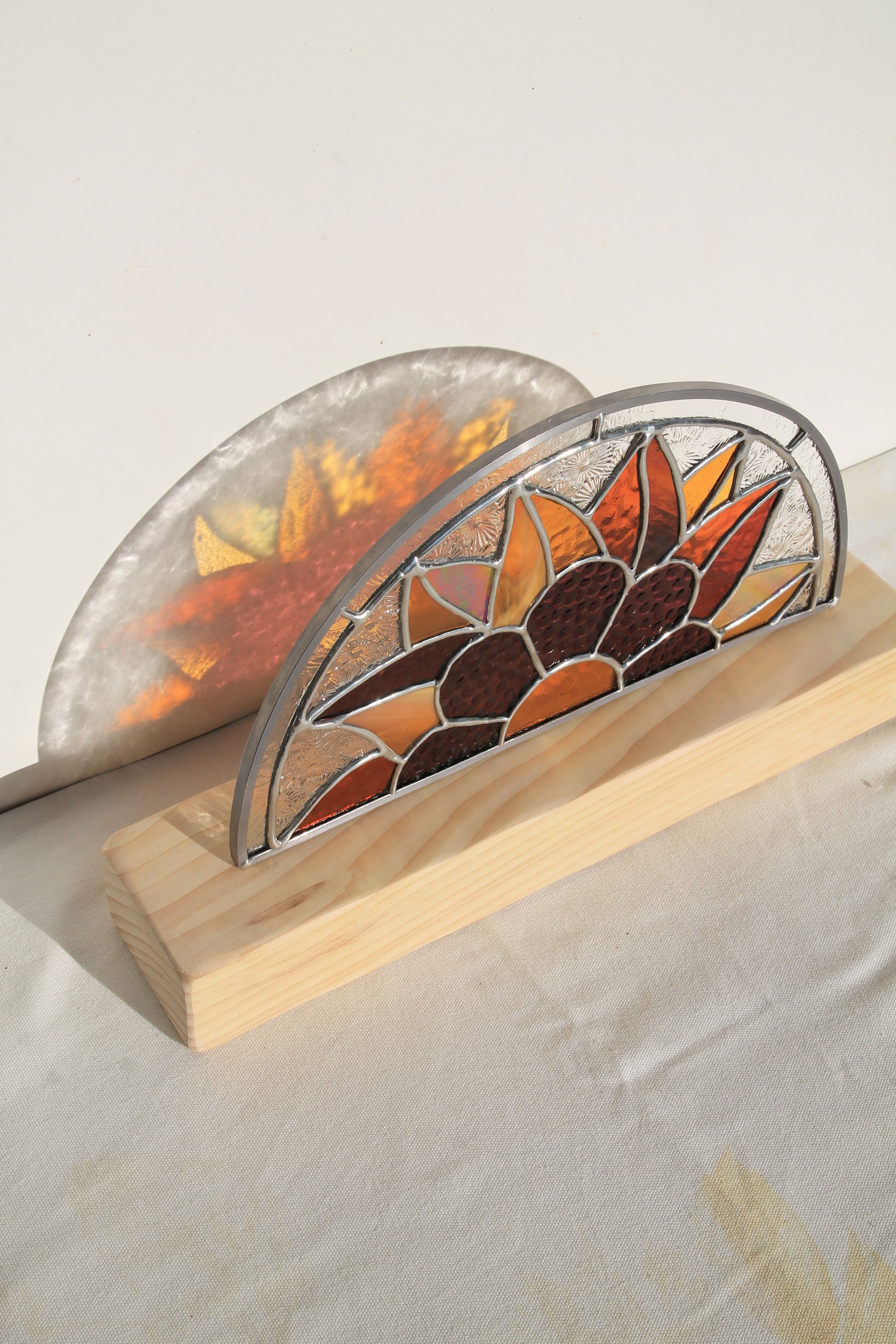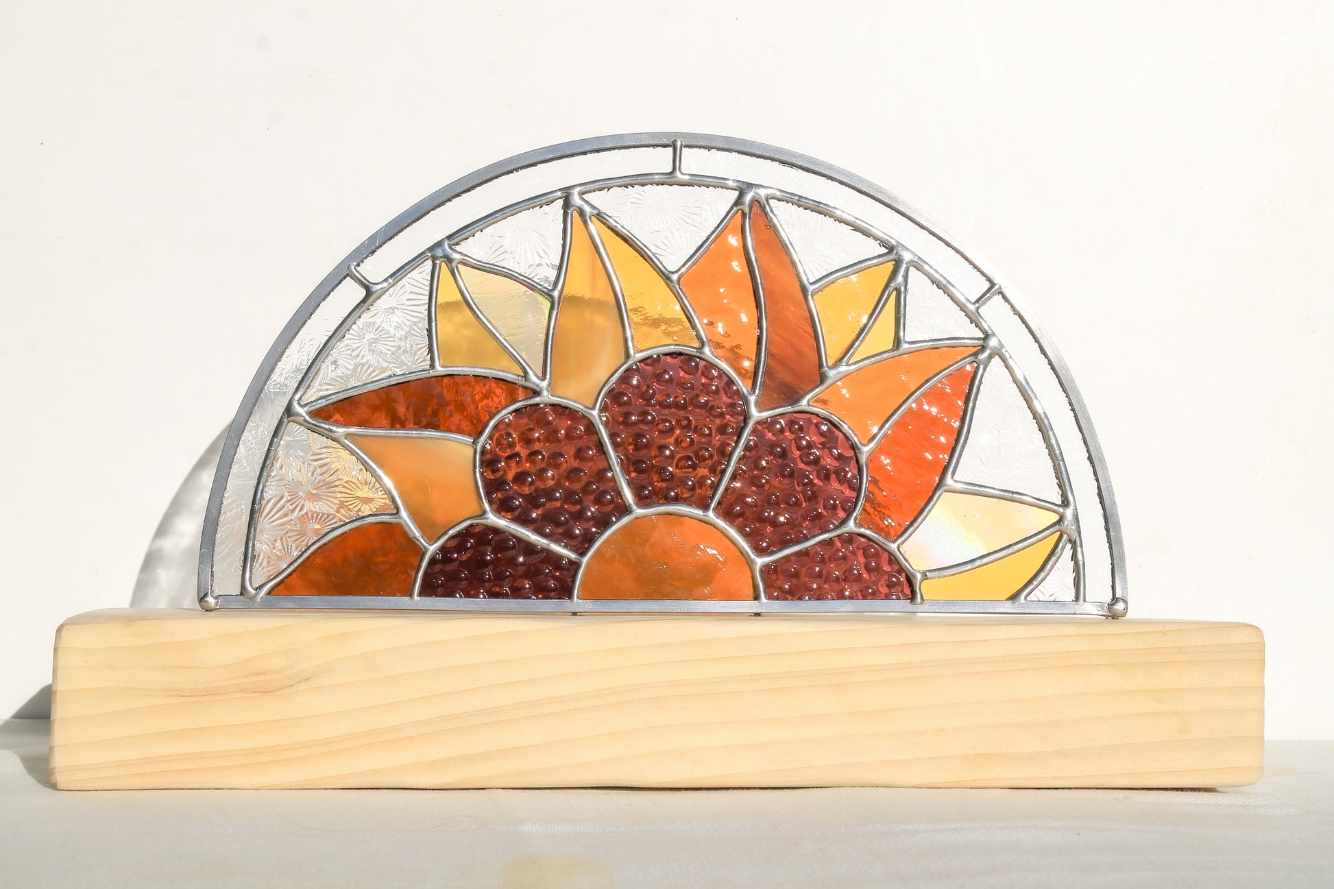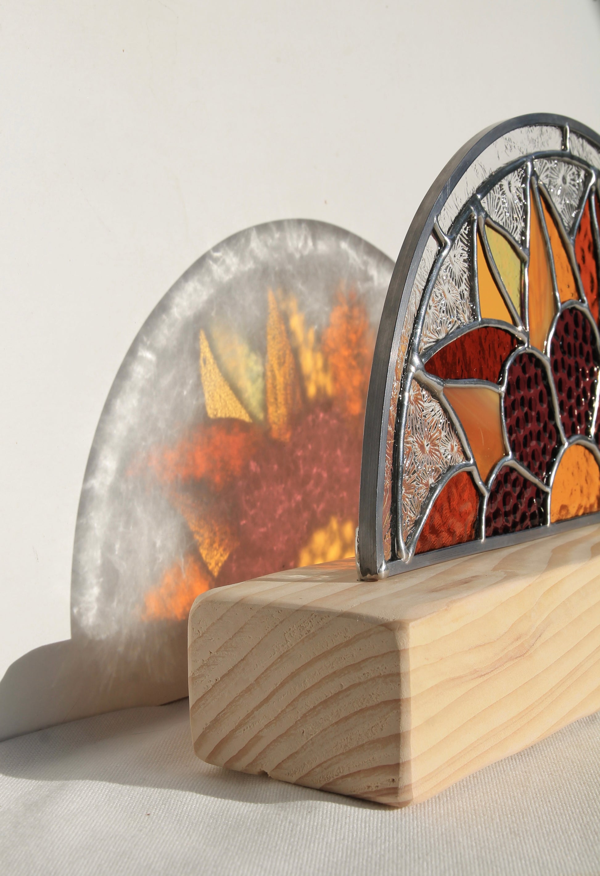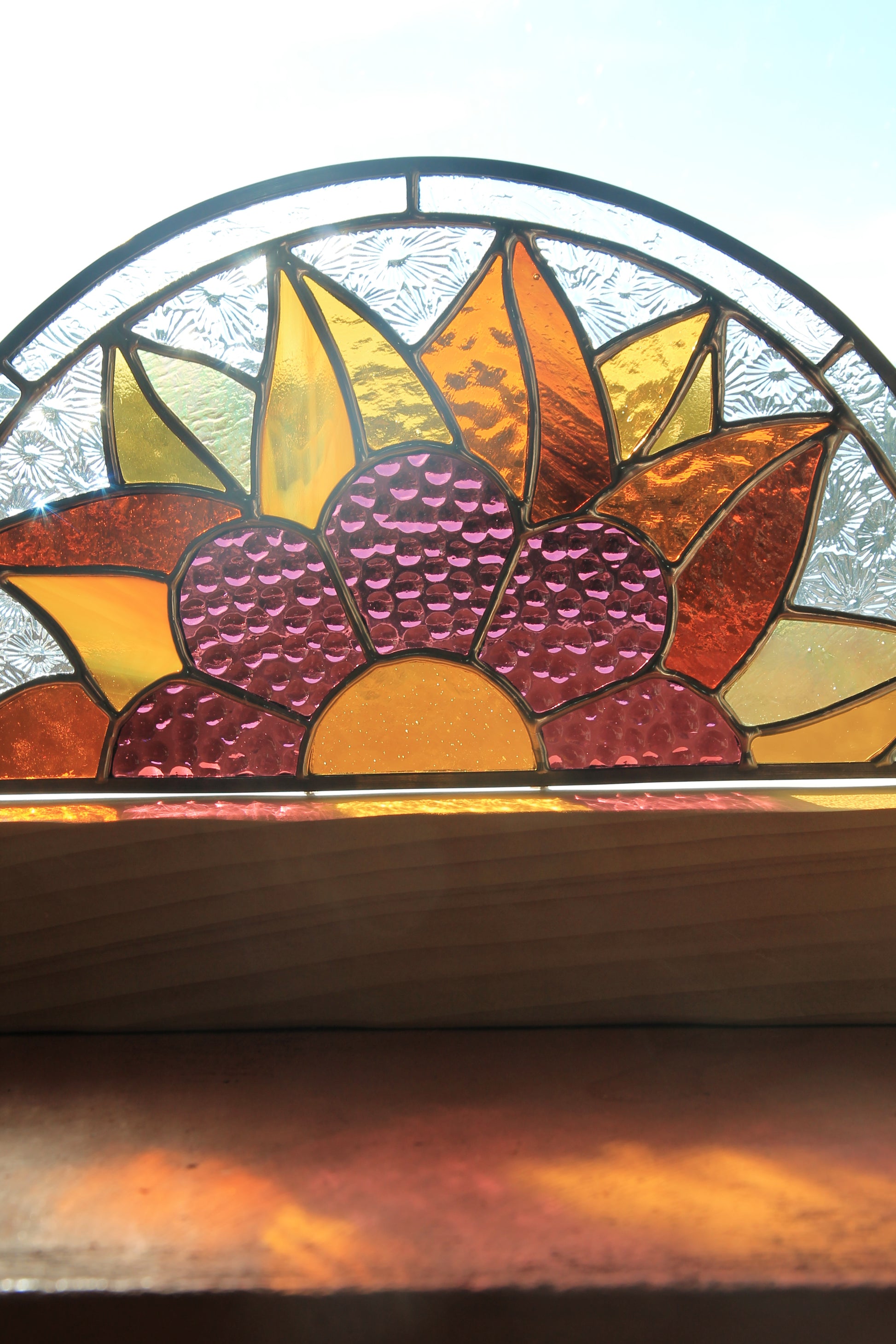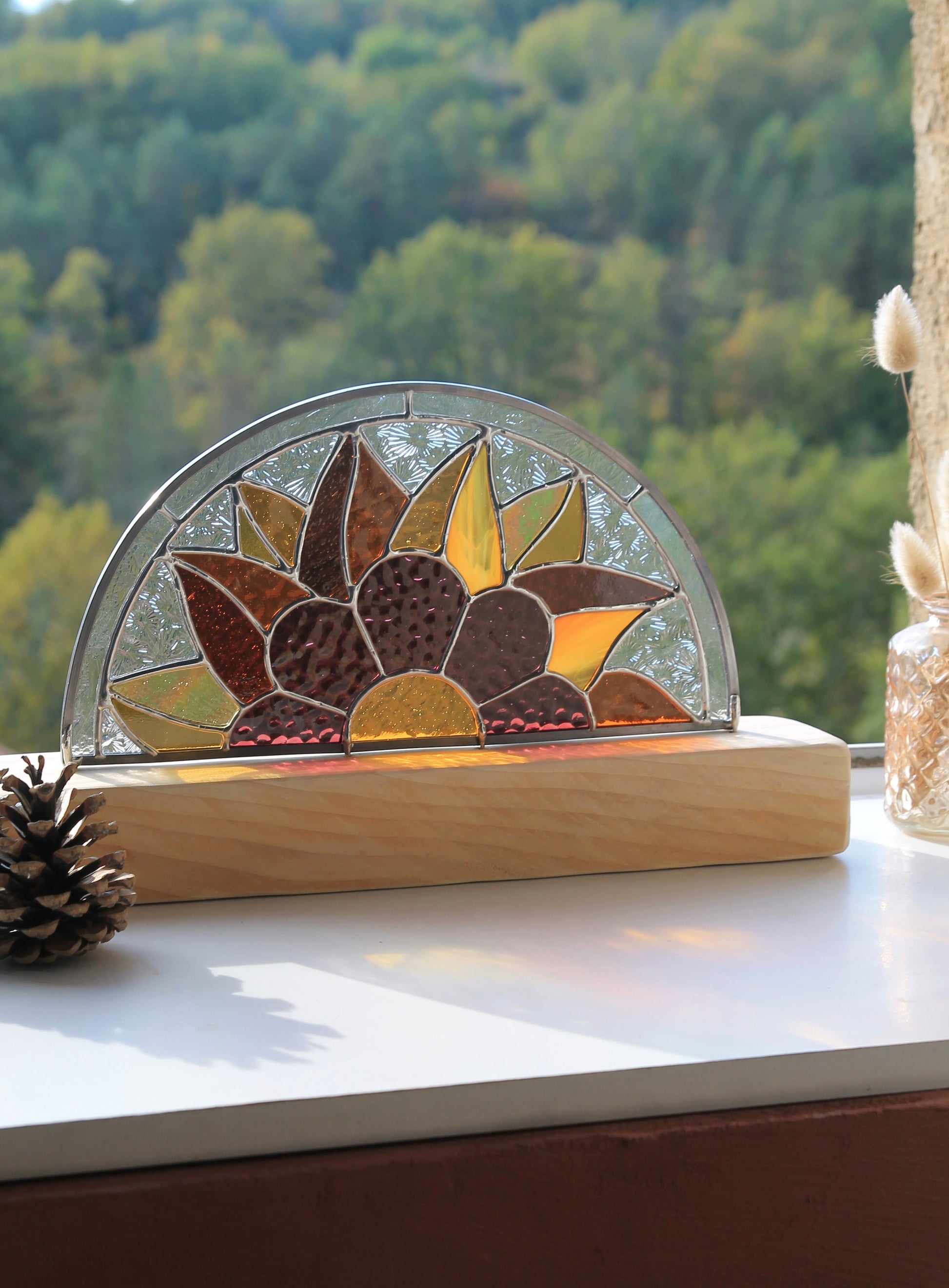 Entièrement façonné à la main dans mon atelier, chaque vitrail est assemblé au cuivre, à l’étain et au plomb selon la technique traditionnelle Tiffany. Les verres peuvent présenter de fines stries ou de petites bulles d’air : des particularités naturelles de sa fabrication qui font son charme
