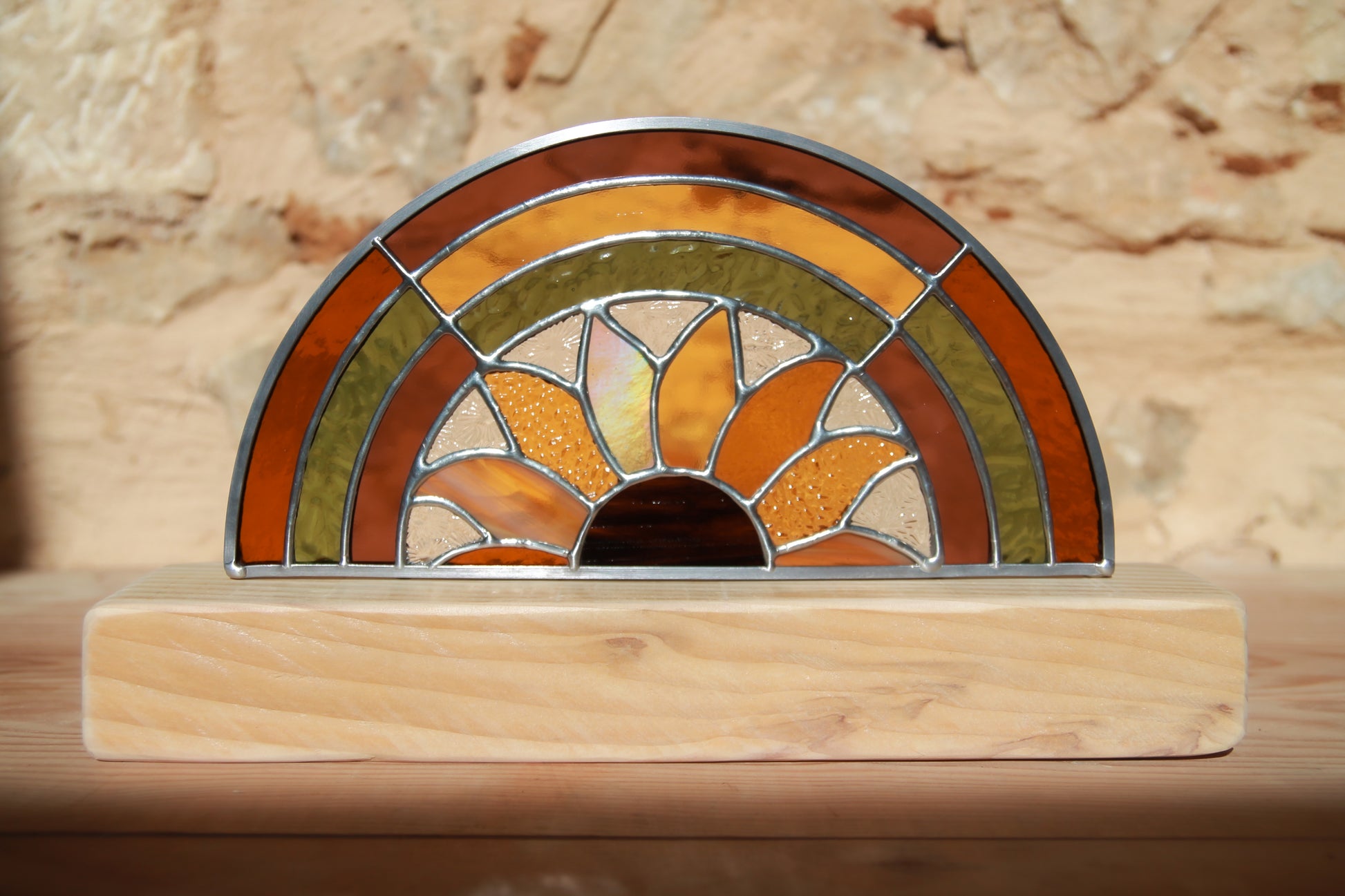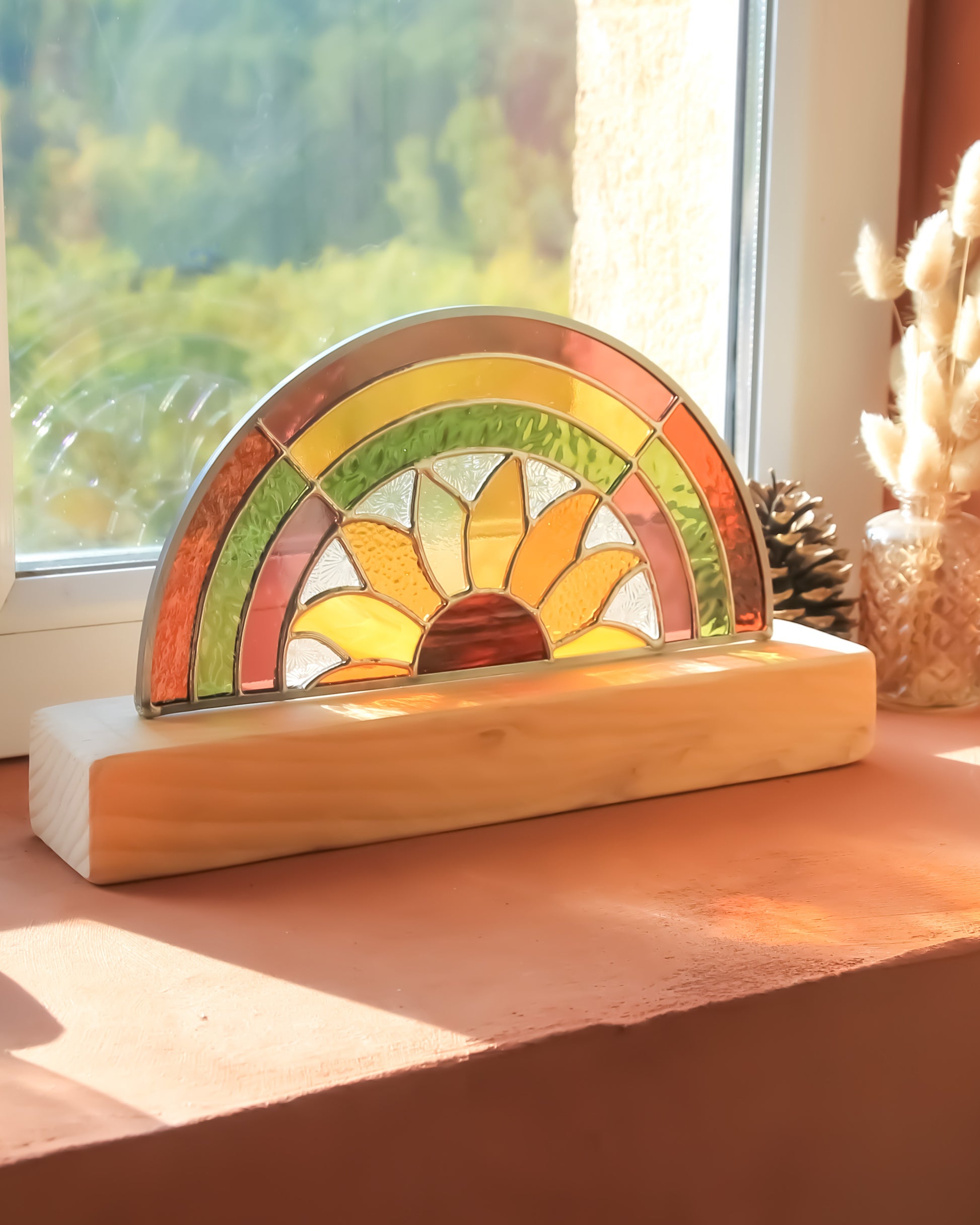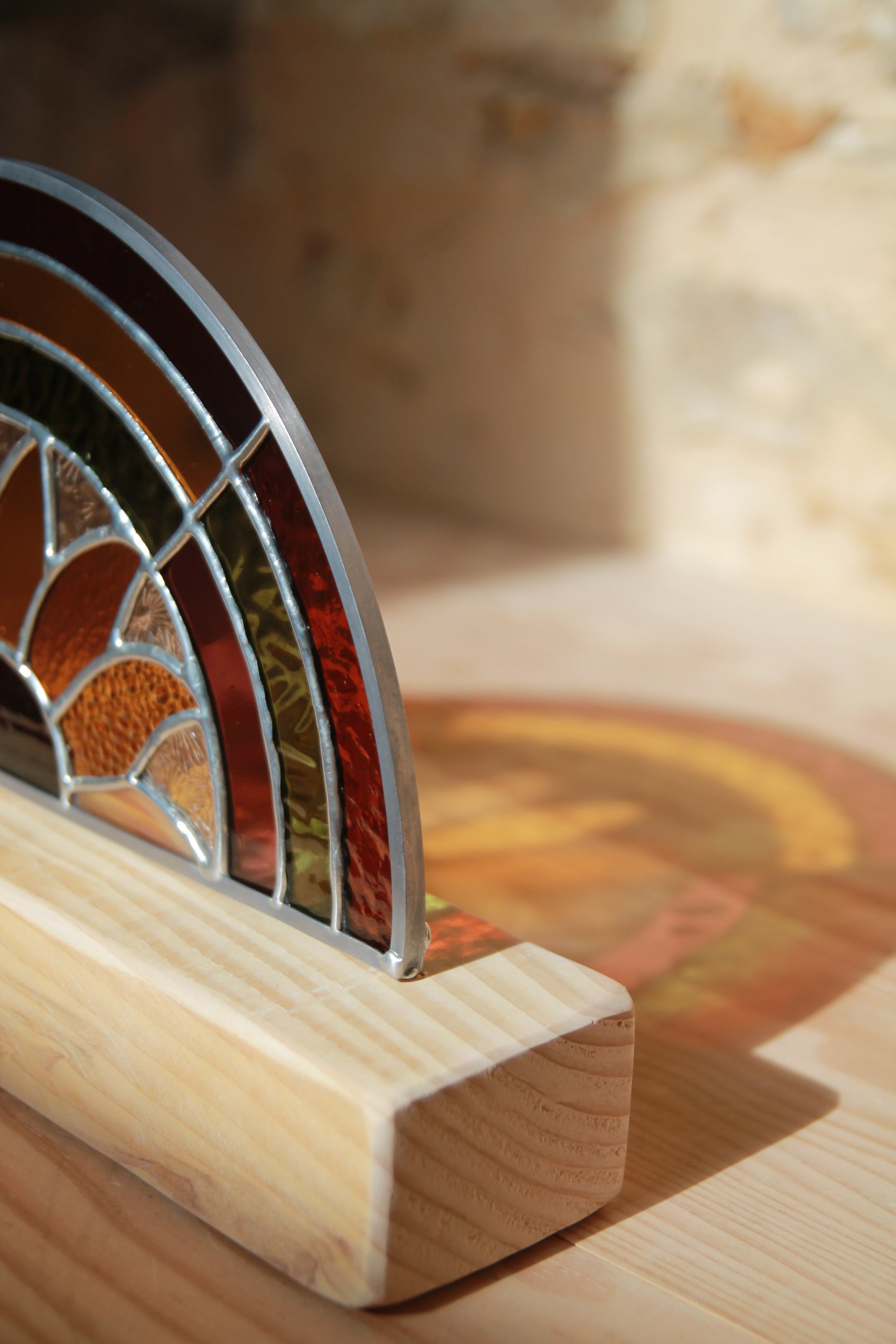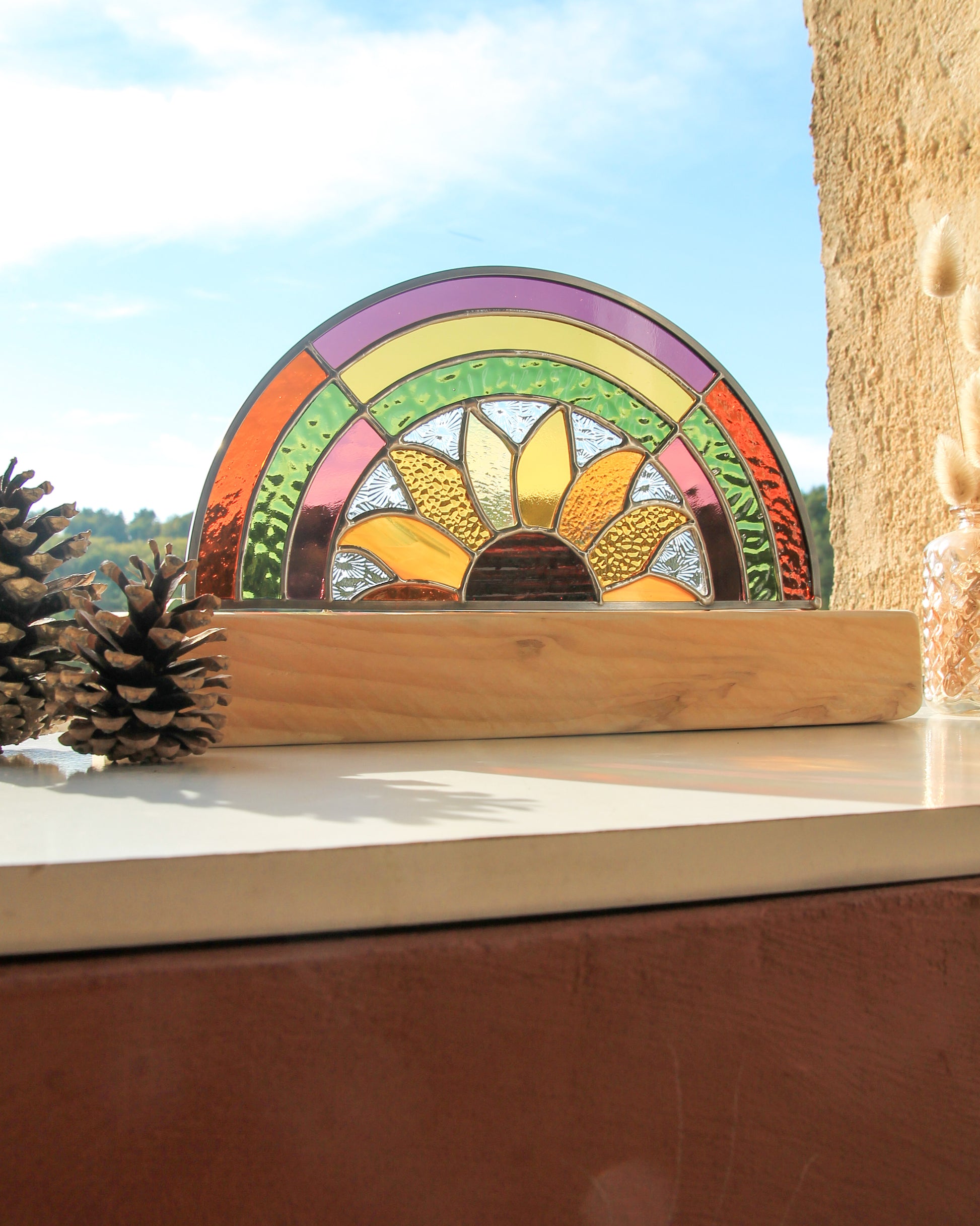 Montée sur un socle en bois façonné à la main, L’Arc-en-sol mesure 18,5 cm de haut (socle inclus) pour 28 cm de large. Placée près d’une fenêtre, elle diffuse une lumière colorée et vivante, créant une atmosphère douce et solaire.