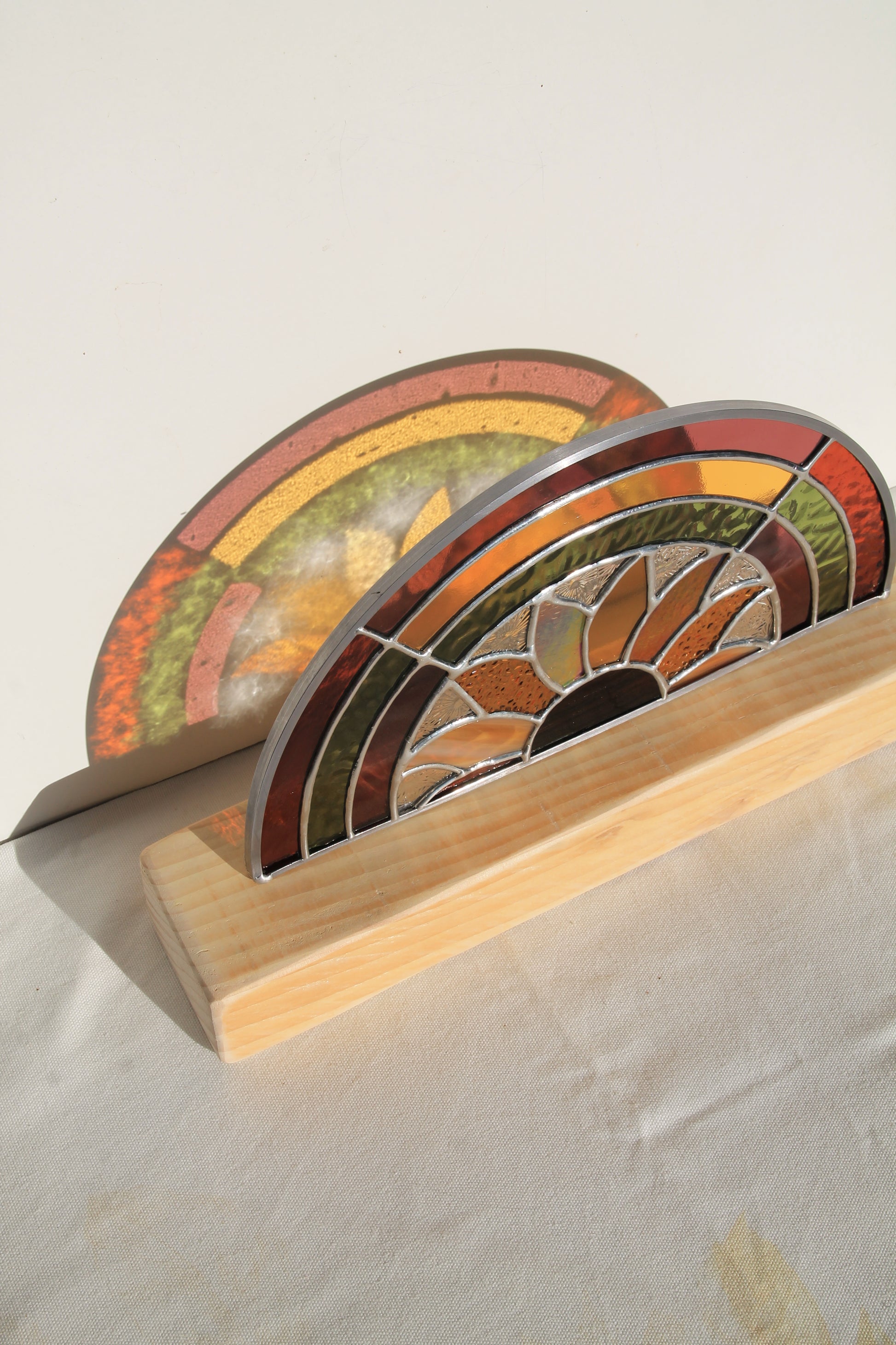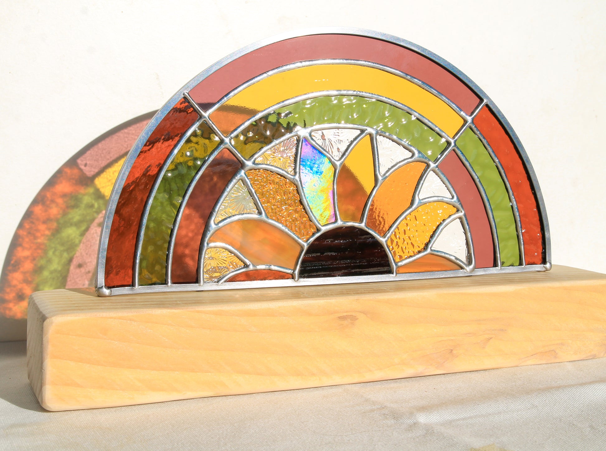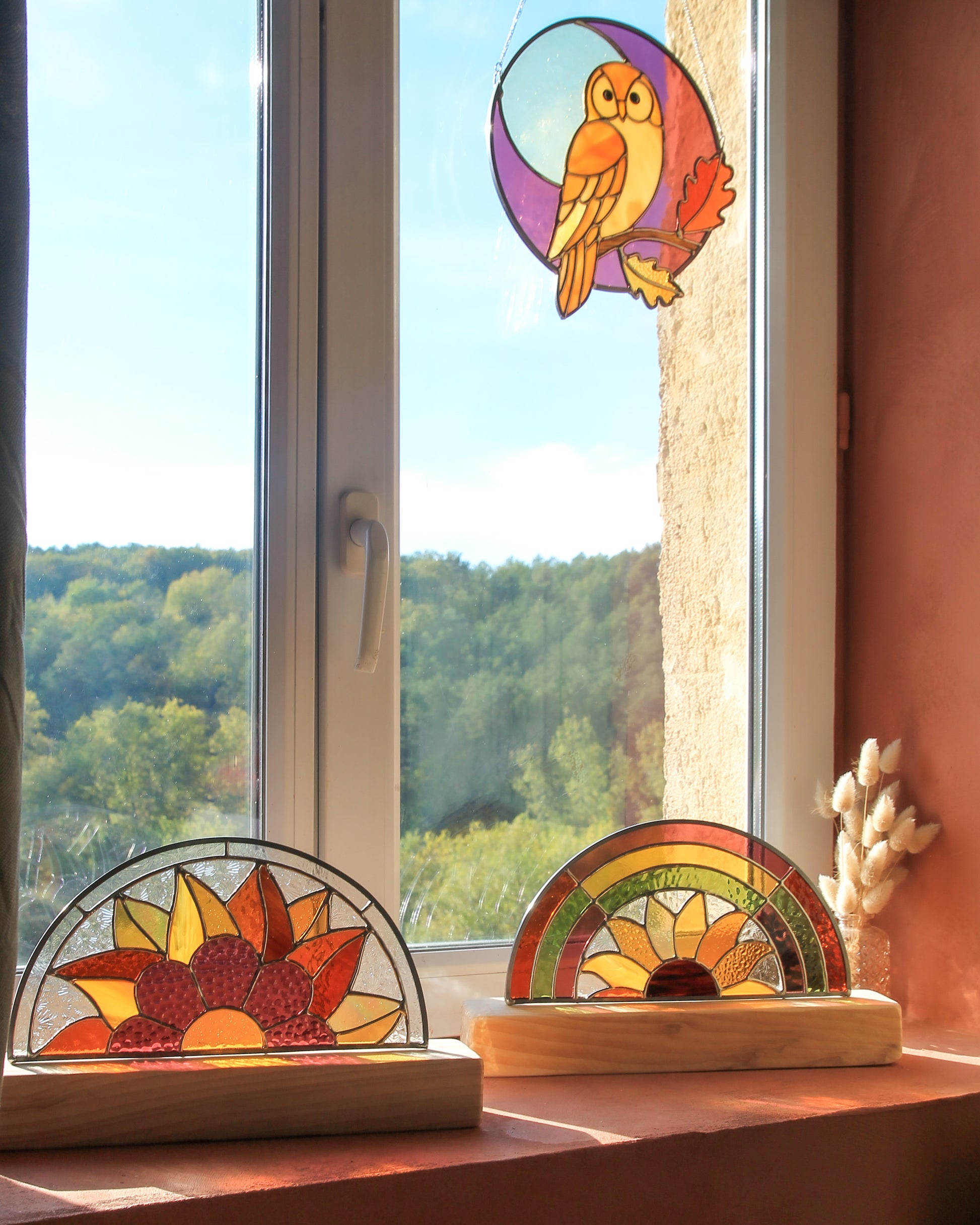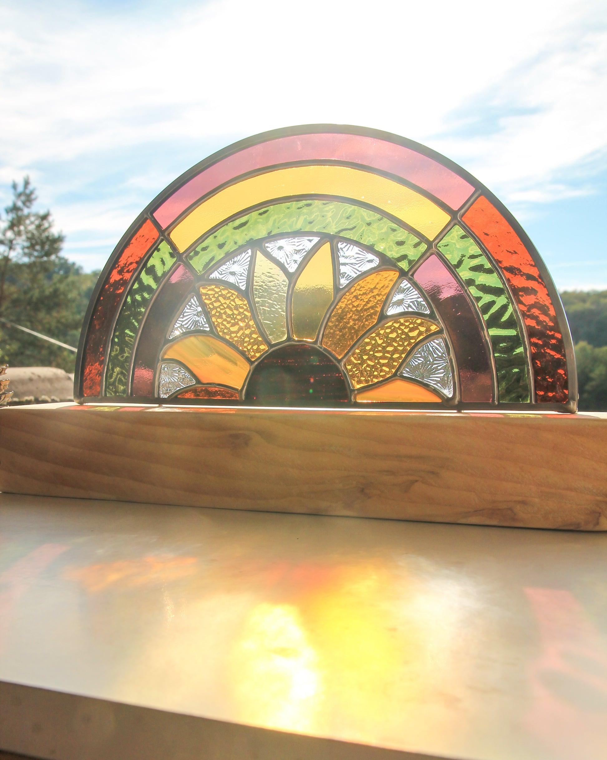 Montée sur un socle en bois façonné à la main, L’Arc-en-sol mesure 18,5 cm de haut (socle inclus) pour 28 cm de large. Placée près d’une fenêtre, elle diffuse une lumière colorée et vivante, créant une atmosphère douce et solaire.