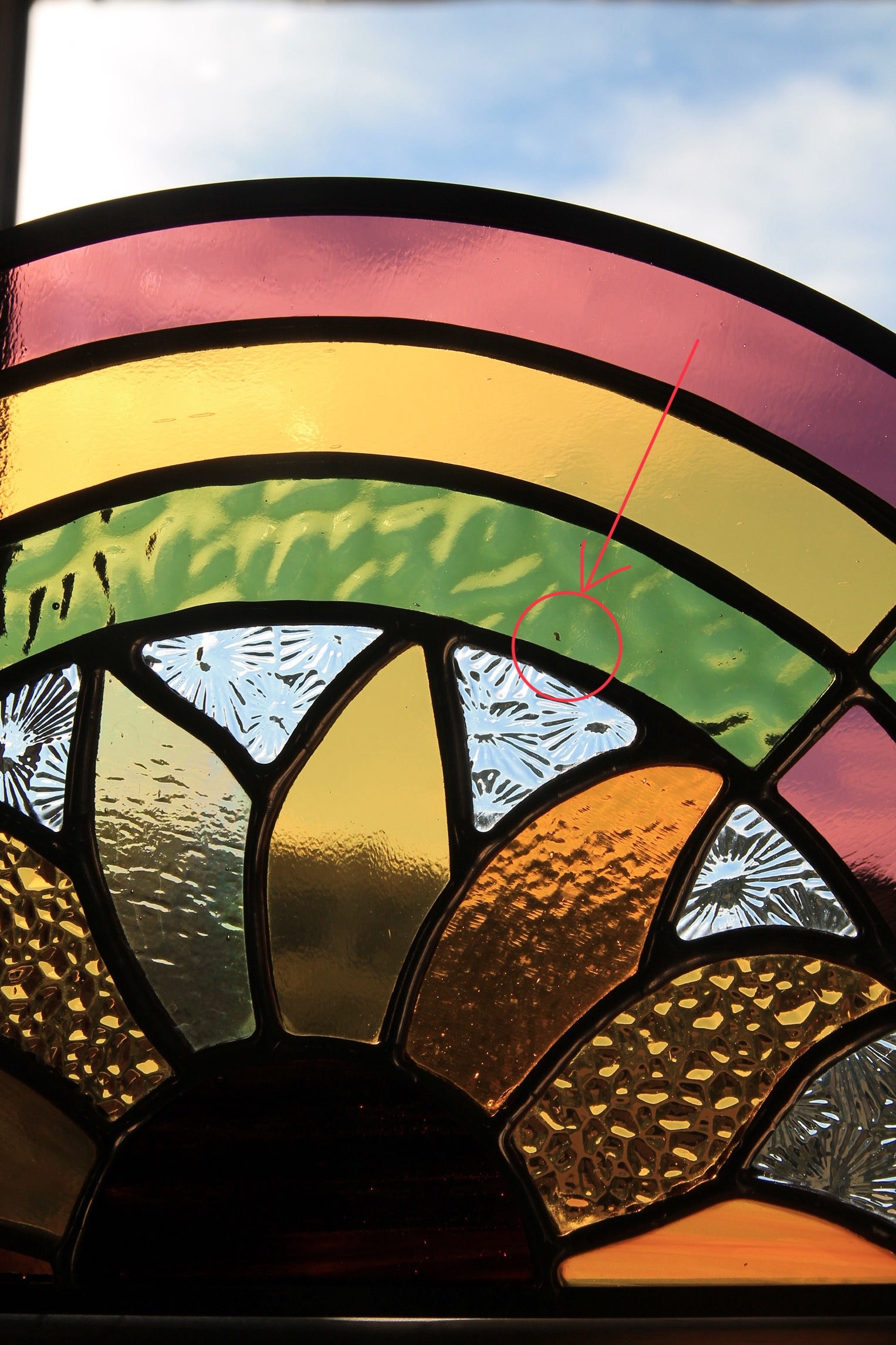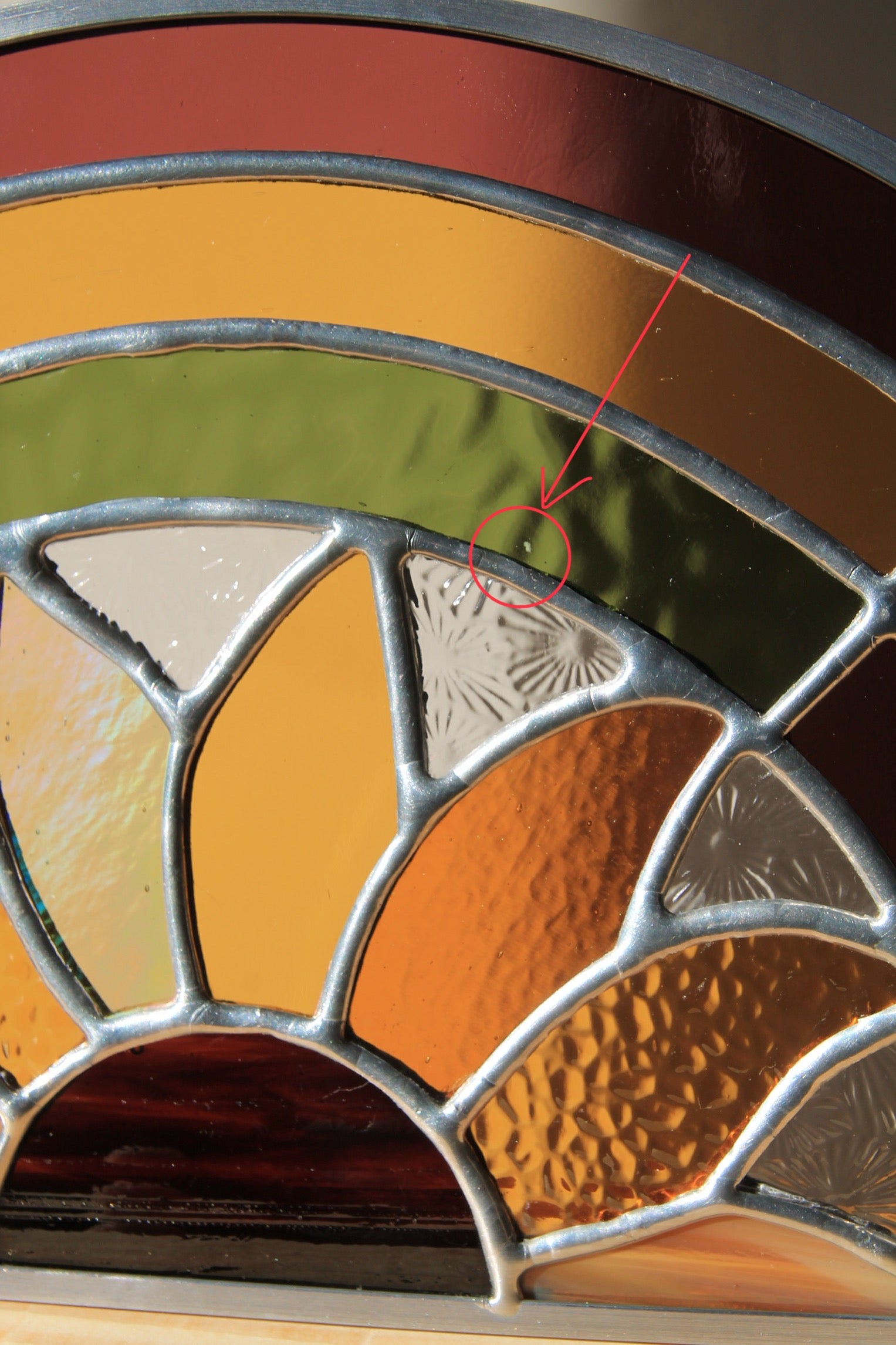 A NOTER : la pièce de verre verte centrale présente une petite inclusion blanche. Ce sont les aléas des verres semi-artisanaux qui peuvent porter ainsi quelques singularités. Ce détail est visible sur les dernières photos.
