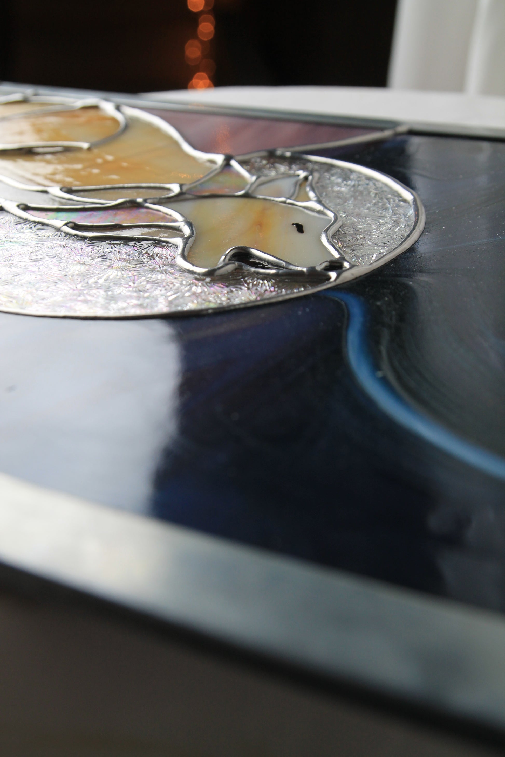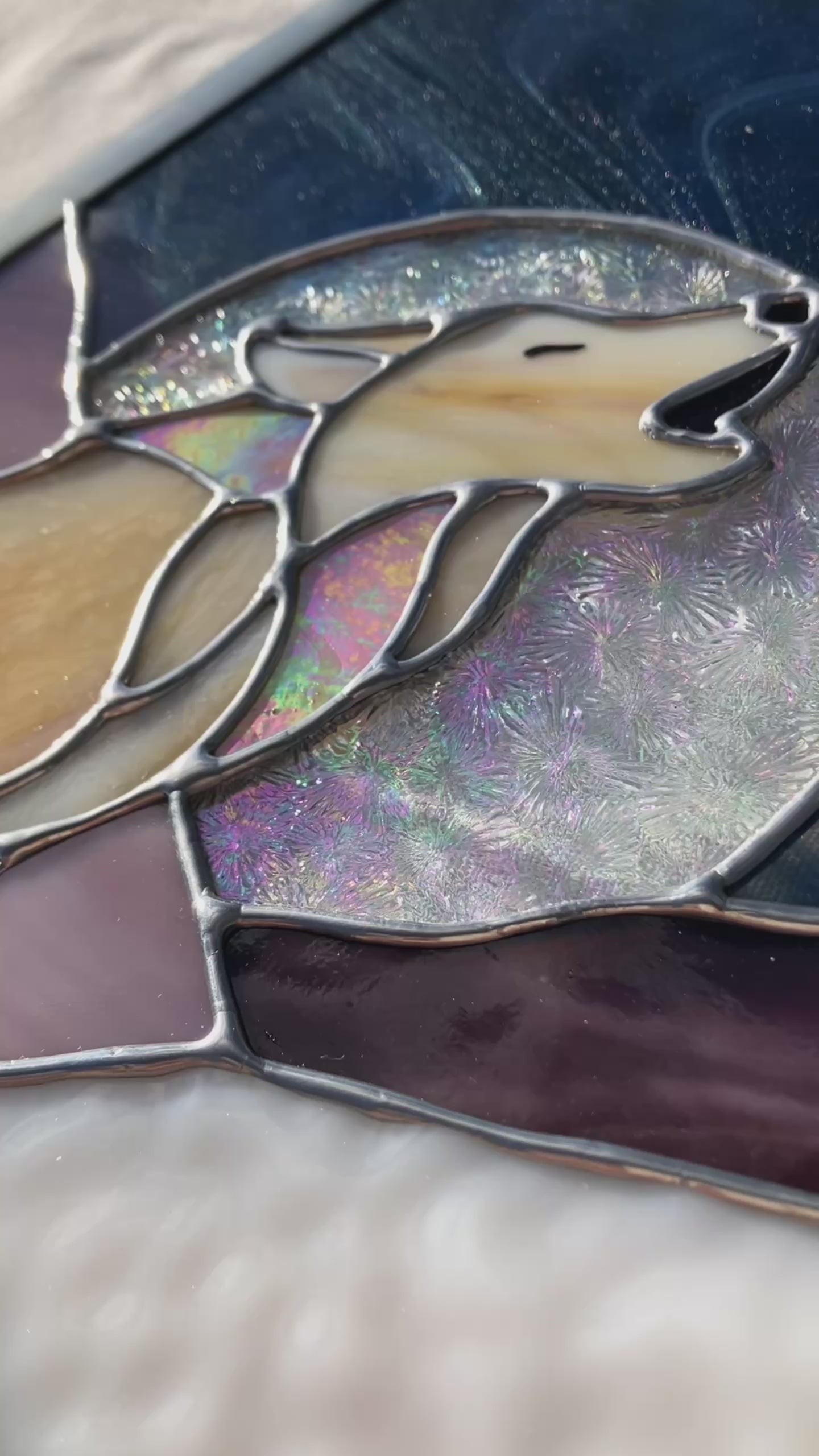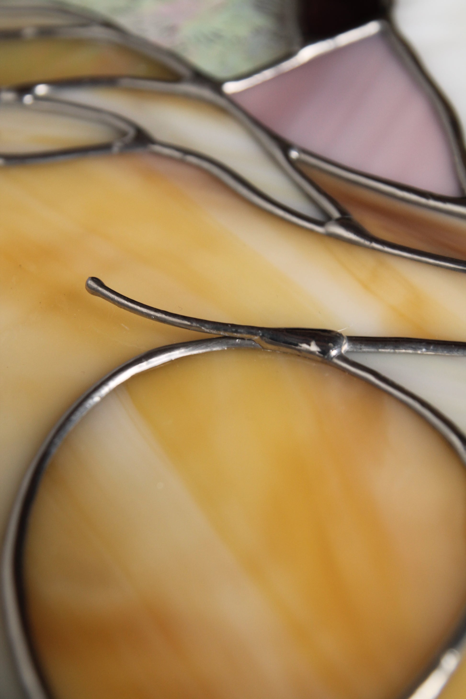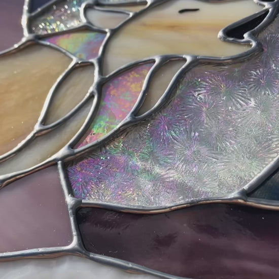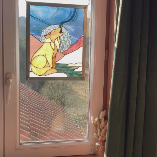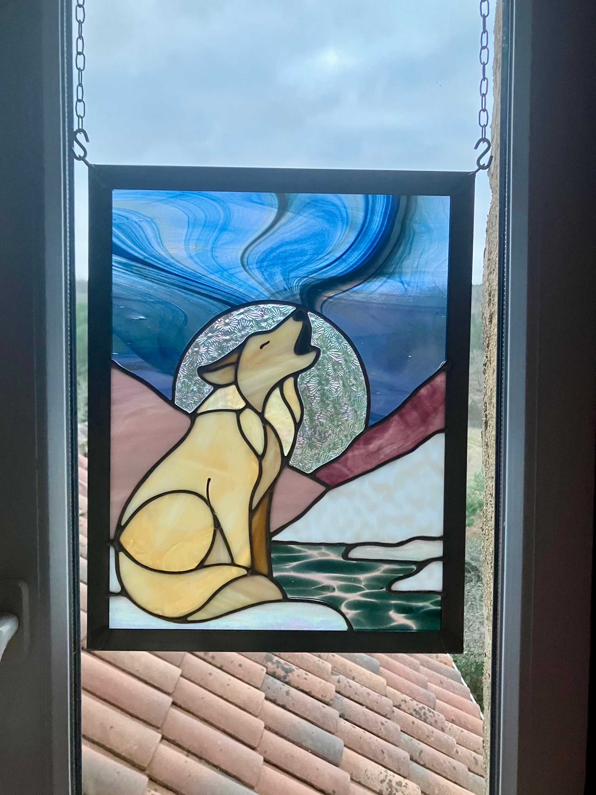Réalisé à la main dans mon atelier du Périgord, ce vitrail est façonné selon la technique Tiffany, à partir de verres opalescents, translucides et irisés choisis pour leur richesse de texture et de lumière. Chaque élément est assemblé au cuivre et à l’étain, selon un savoir-faire artisanal. Le cadre extérieur est quant à lui réalisé en zinc.