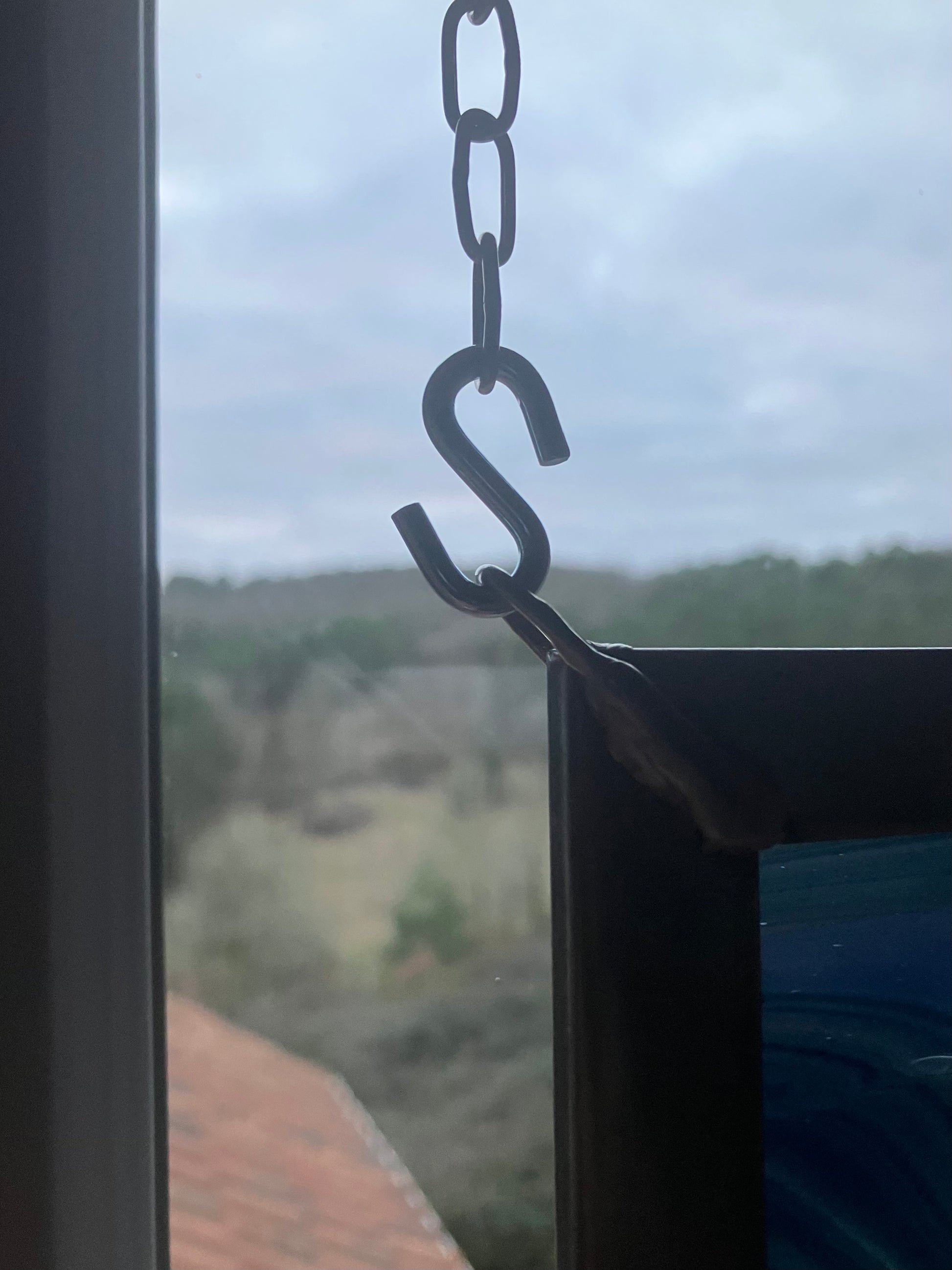 👉 par mesure de sécurité la suspension se fait par des crochets S visibles sur les deux dernières photos. Cela vous permet également de changer la chaîne de suspension à votre préférence.