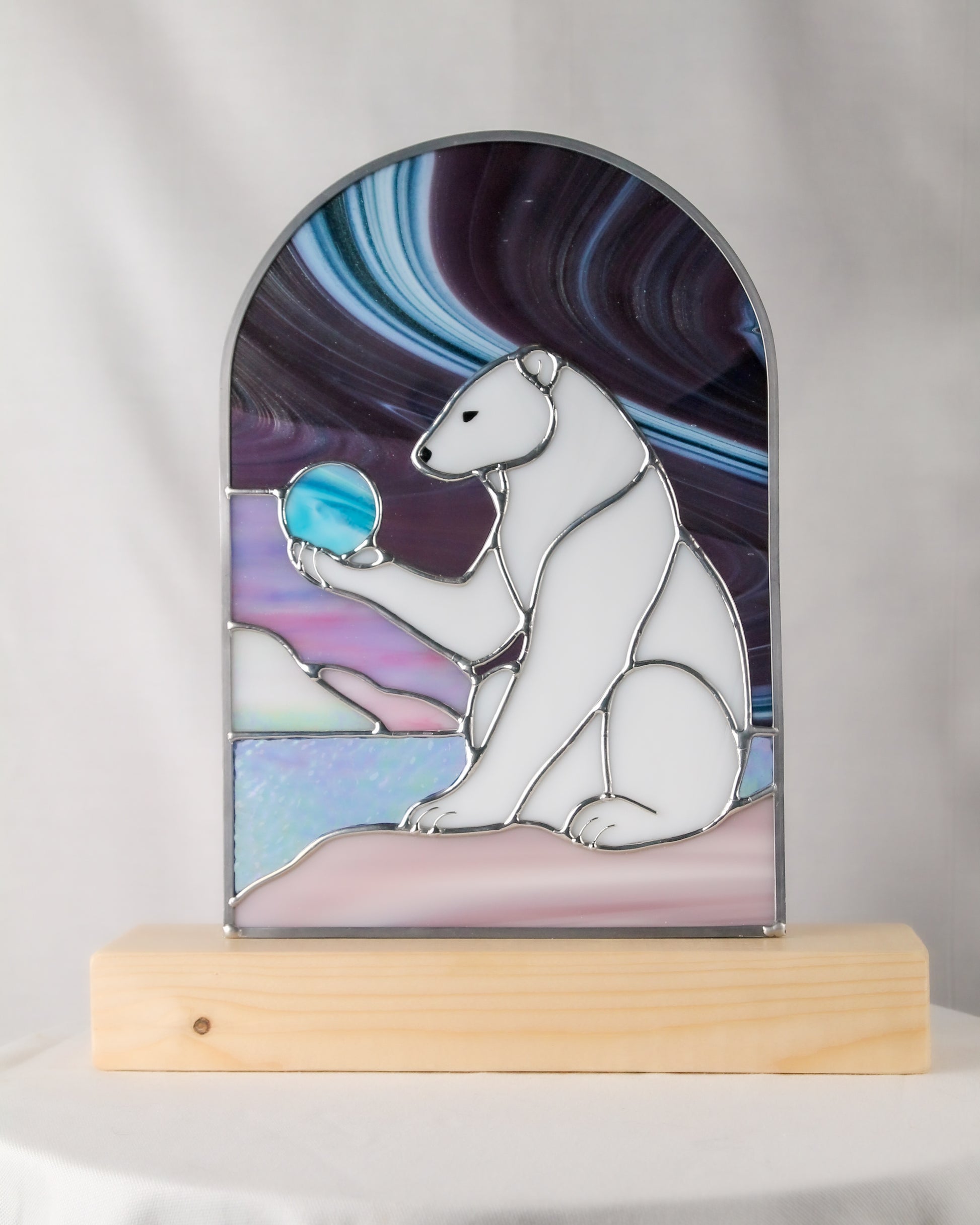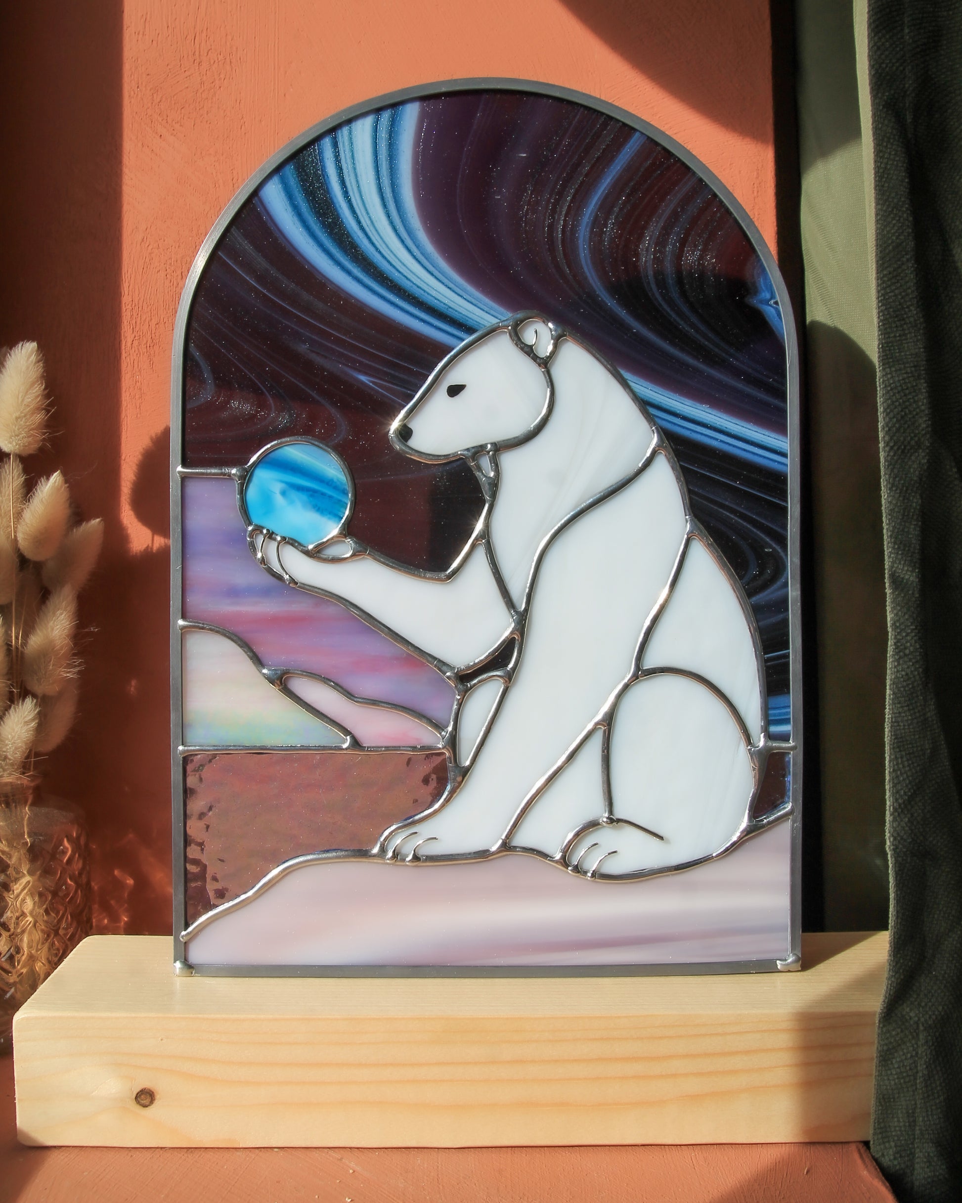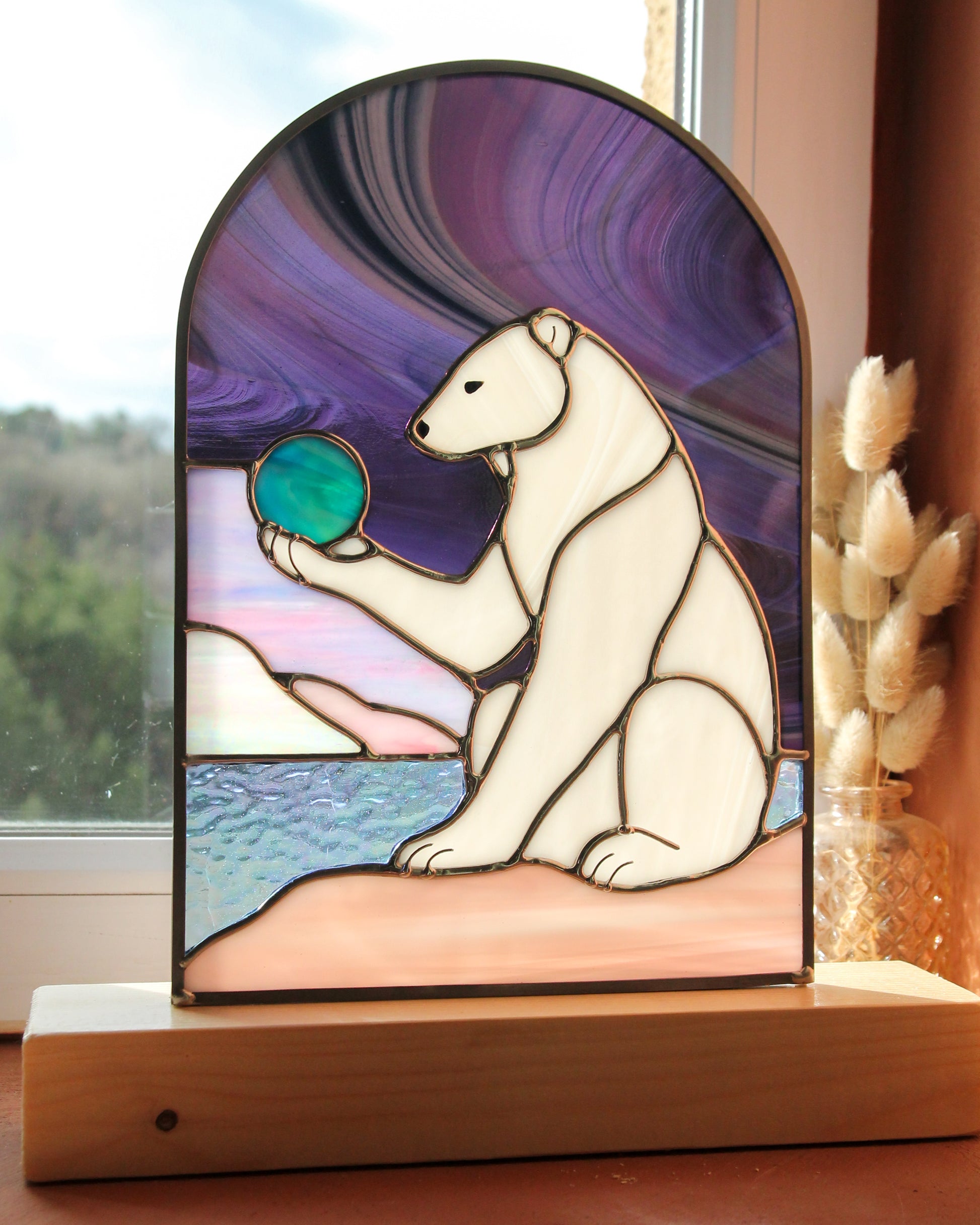 Réalisé à la main dans mon atelier du Périgord, ce vitrail est façonné selon la technique Tiffany, à partir de verres opalescents, translucides et irisés choisis pour leur richesse de texture et de lumière. Chaque élément est assemblé au cuivre, à l’étain et au plomb, selon un savoir-faire artisanal.